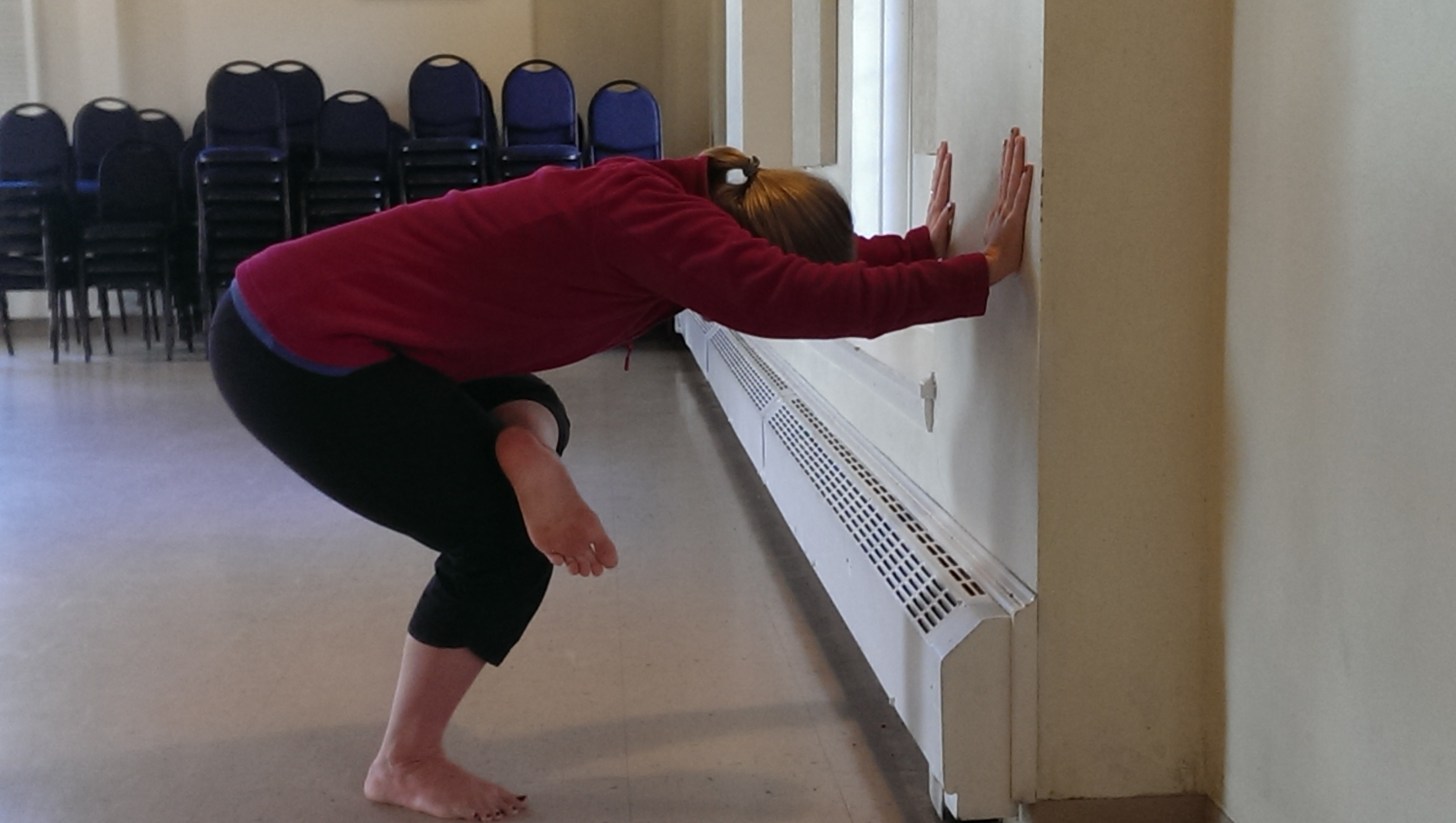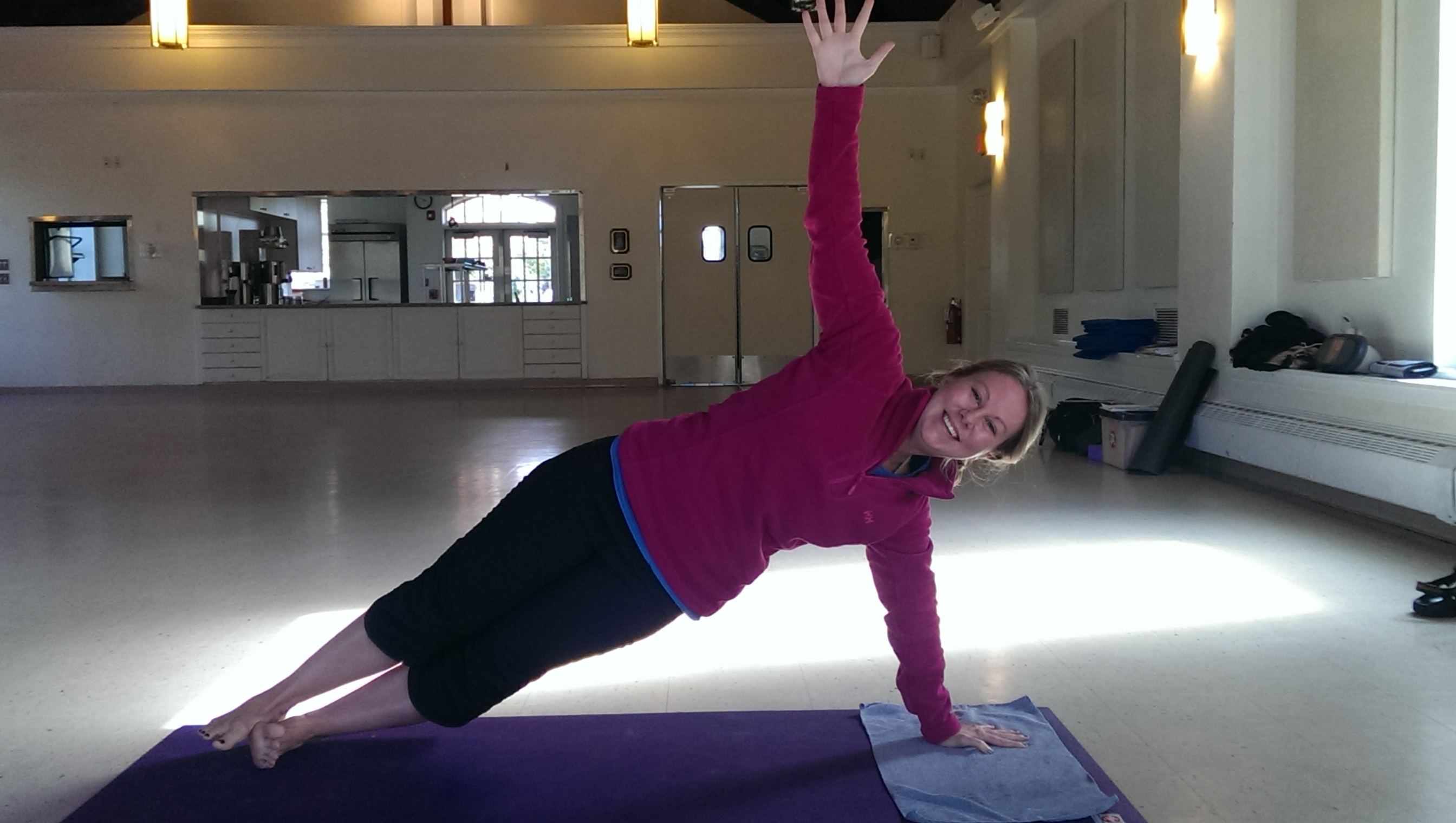 Here below Heather demos the opening pose. From there the practice mounts into a challenging abs and core endeavor – will arm strengthening poses as well.
