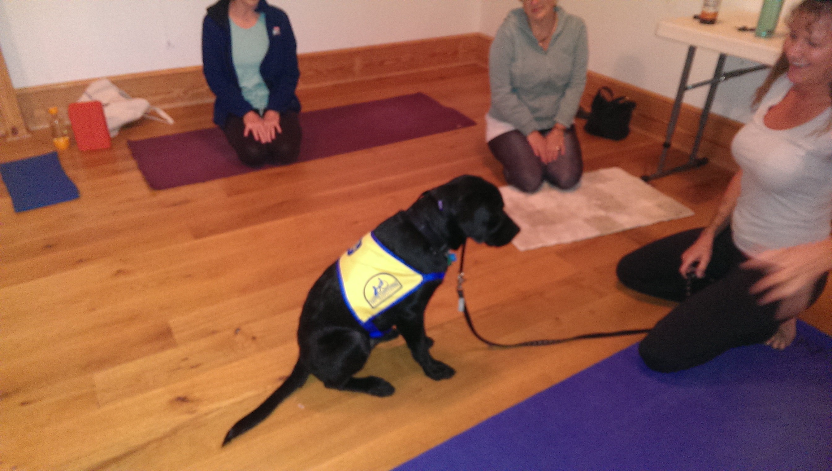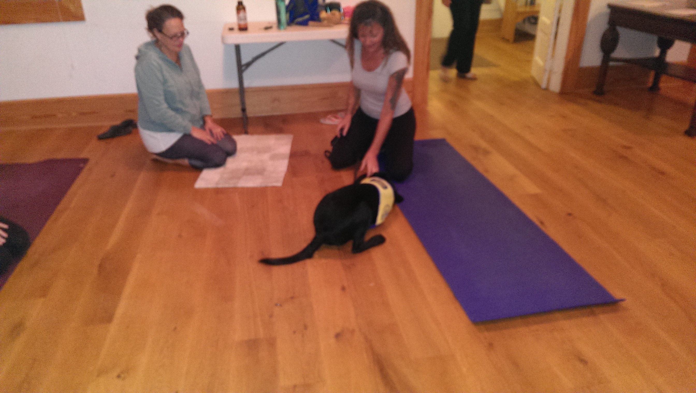 As you can see Liam is wearing his official vest to indicate that he is a service dog, and for now he is still in training as he has only been trotting this earth for 20 weeks or so. Give him a few more months and he will be a real pro!! And I mean that because he aced his first yoga class.