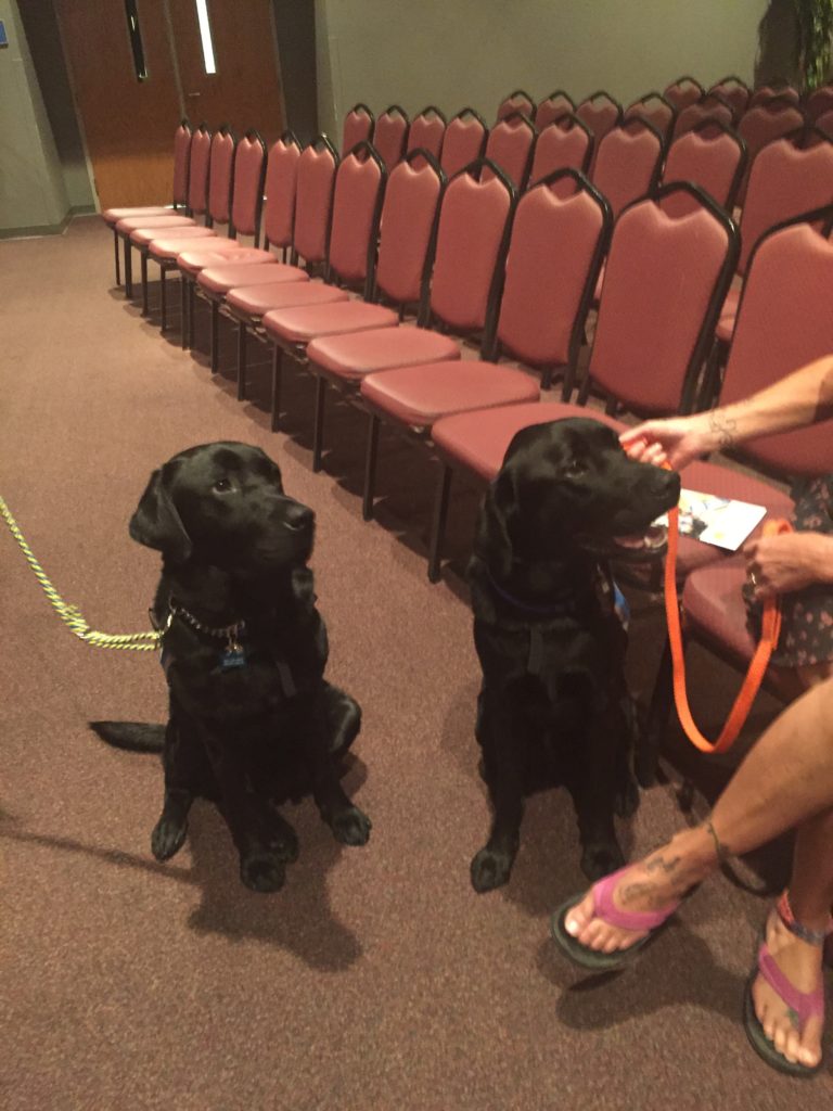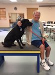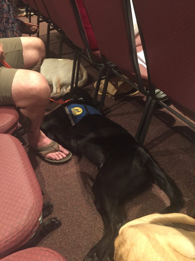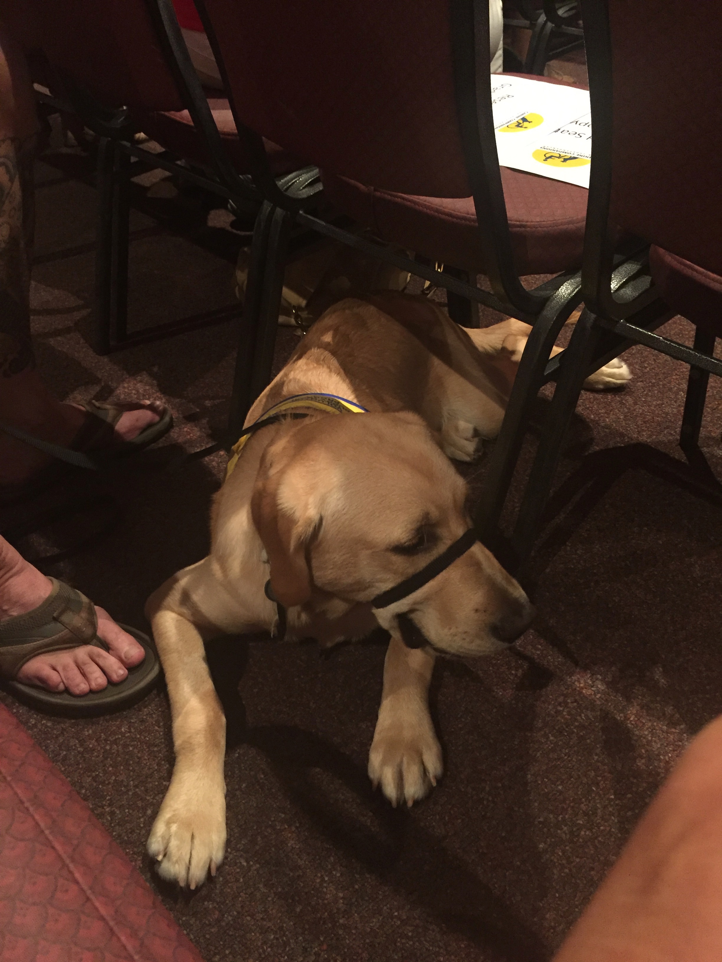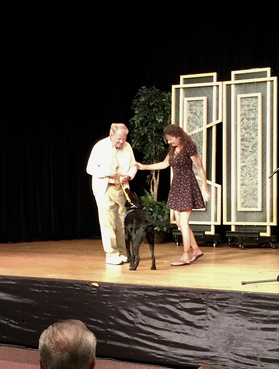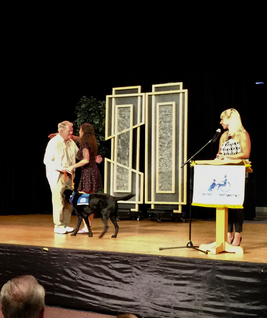 Ok, the moment of truth has arrived – going on stage for the formal graduation ceremony. Here below, Tina has brought Lima on stage to make the pass over to Butch, who is in need of a hearing dog. (Note: Butch and Liam lived together on the CCI premises for the final two weeks of Liam’s training to make sure they were a good match. So this is not Liam’s first time meeting Butch.)
