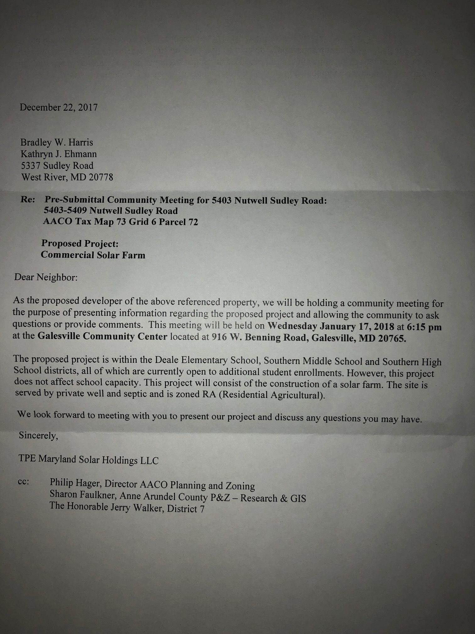 Please spread the word to everyone that can participate and help our Deale / West River Community recommend a more appropriate/alternative location for Commercial Utility-Scale Solar Power Plant (invitation attached). It is also interesting that many of my neighbors that I have talked to did not get this invitation so please help spread the word.