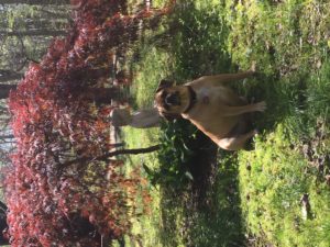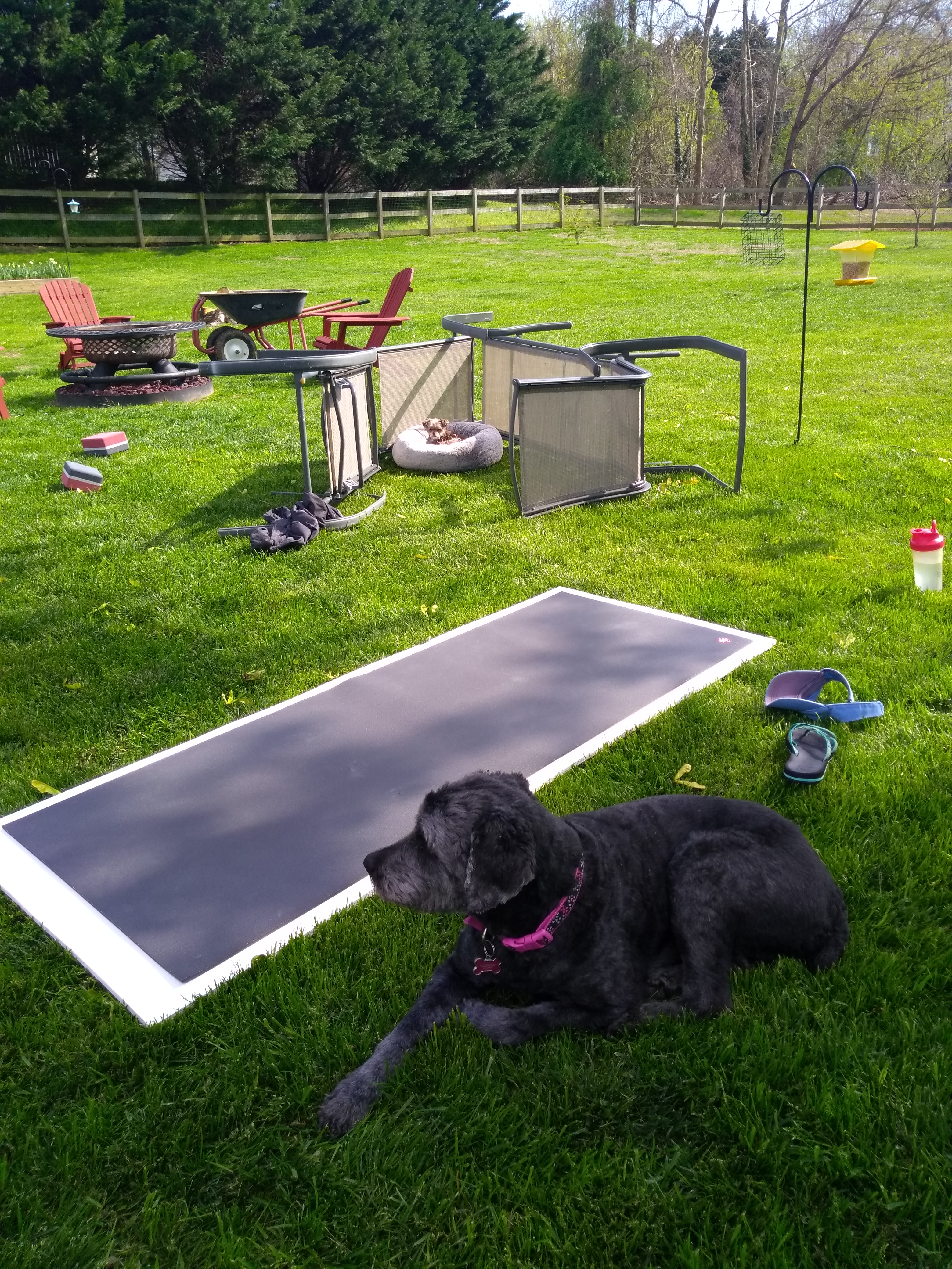 Note: in the below photo, there is not one dog, but two. The second dog, Coco, is in her doggie bed with overturned chairs all around her to hide and protect her from the hawks overhead!!