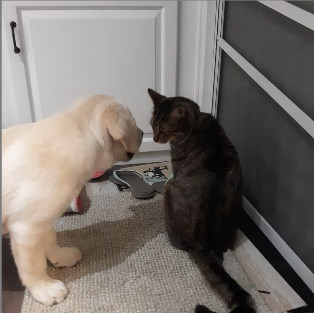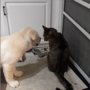 Note: This is Tina’s new pup, Finn. As you may recall, while in Maryland Tina raised two service dogs, Liam and Nitro, both of whom are now on their respective assignments. But Finn is not a service dog, rather the new family pet. Here he is meeting Luna, who was “raised” with both Liam and Nitro. So Luna is well-acquainted with labs and is a champion dog wrestler.