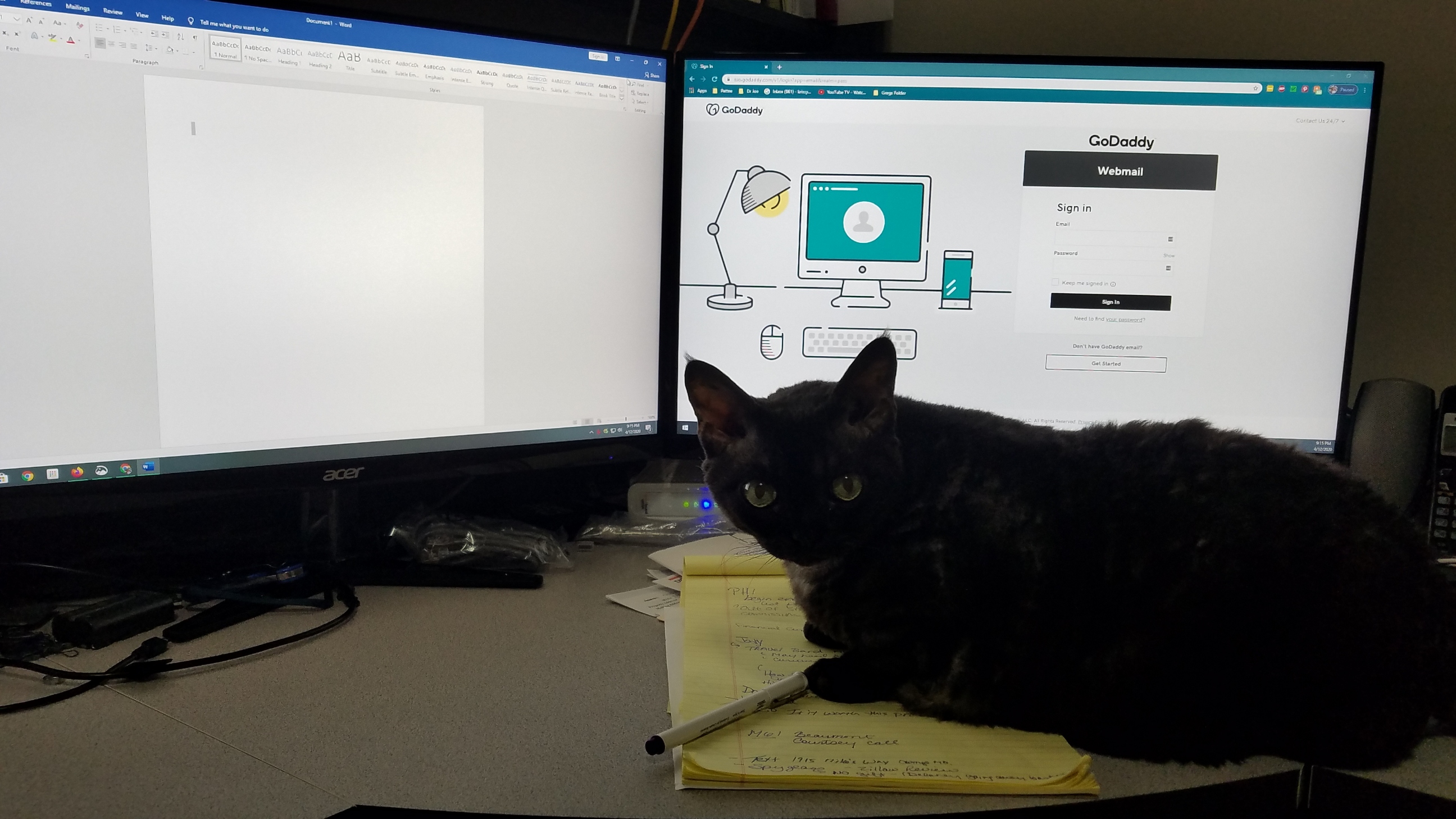 Trying to work around the cat. He likes to watch the screen when I type. Tried locking him out of the office, but my husband is on conference calls and he howls at the door.