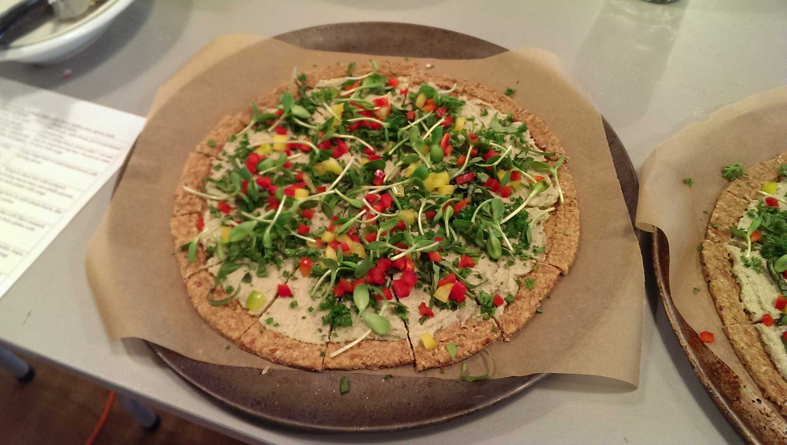 Here below is Bethanne and Kenny’s raw, vegan pizza. That’s right – not only no animals products but no heat either. The “dough” is completely raw made from crushed almonds and seeds, the sauce from cashews, and the toppings all veggies.