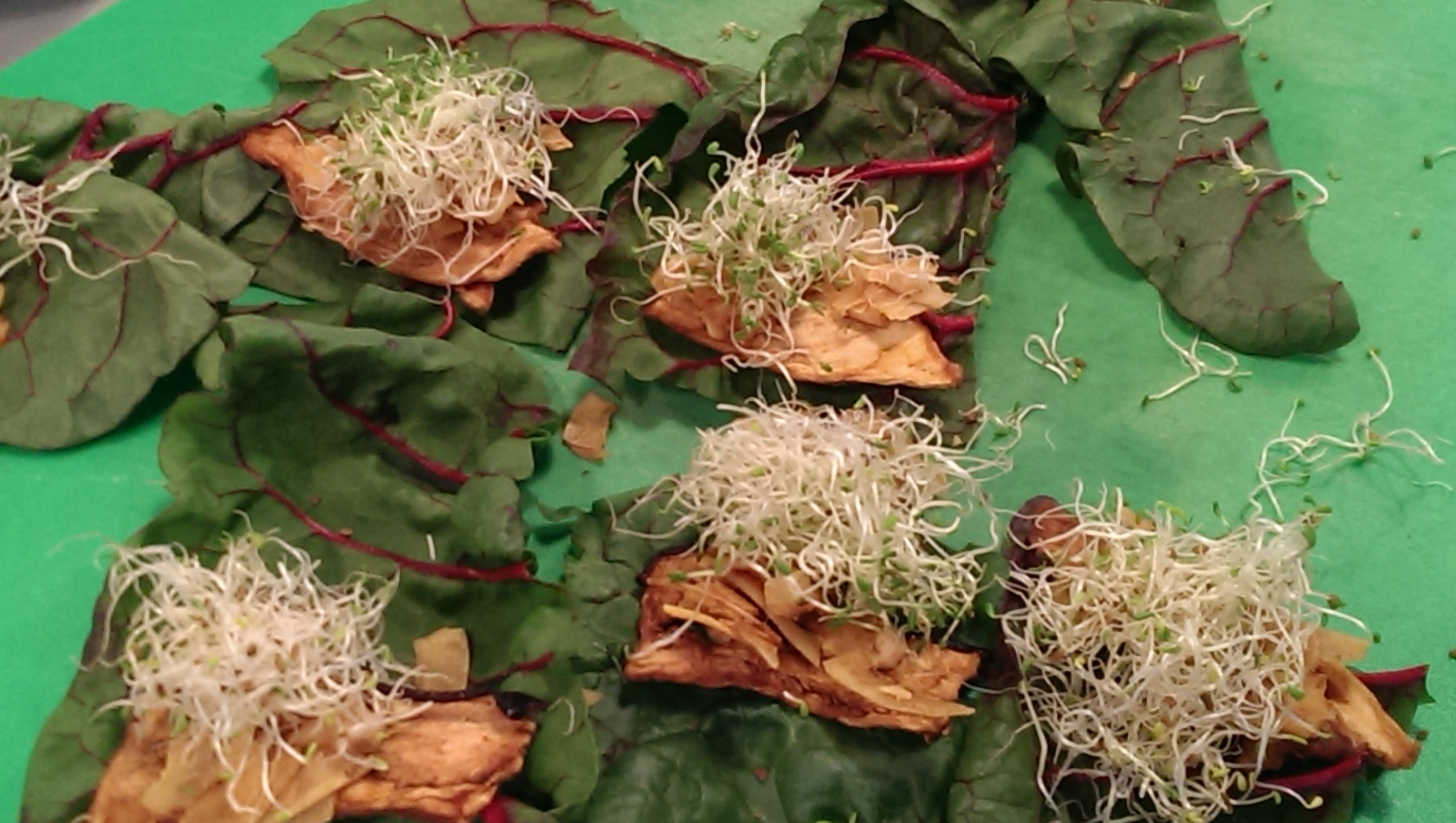 Some of the the other appetizers included spelt bread rolls along with a squash soup, “crab” cakes made from beans and zucchini, lentil & brown rice sliders, a great raw / slaw salad, and more including these below raw eggplant “bacon” wraps with a smoked flavor.