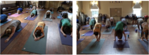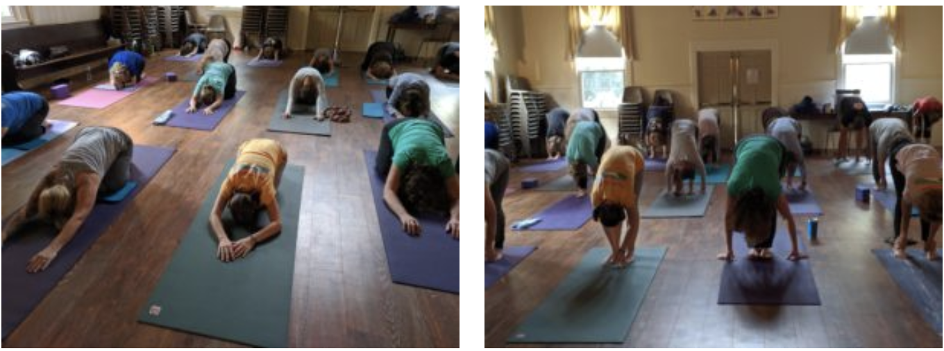 Standing position / wiggle toes, angle rolls, bending knees, leg rotations / roll shoulders / urdhva hastasana / swan dive / back bend / standing half-moon / talasana / rag doll / back bend / wide angle side bend / side angle swan dive / table / cat – cow / leg back / puppy dog / sphinx / cobra poses/ child / down dog / (balancing table) / wide angle child’s pose / seated twists / oyster / seated forward fold / bound angle / balancing ball / supine / legs in air / bound bridge pose / hip opener / rocks and rolls / seated breathing