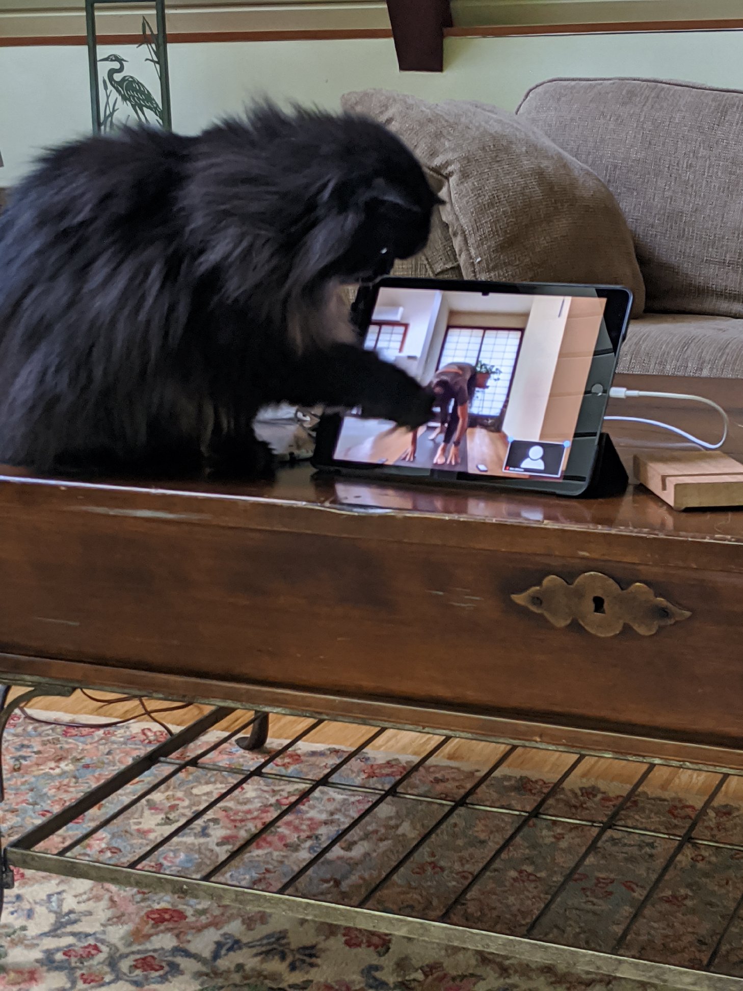 Things can go haywire when leading an online class. There can be connection problems, technical issues, teaching debacles, and general yoga pitfalls. That is why I rely on Georgie’s keen adjustments and penetrating vision to keep me on the up and up.