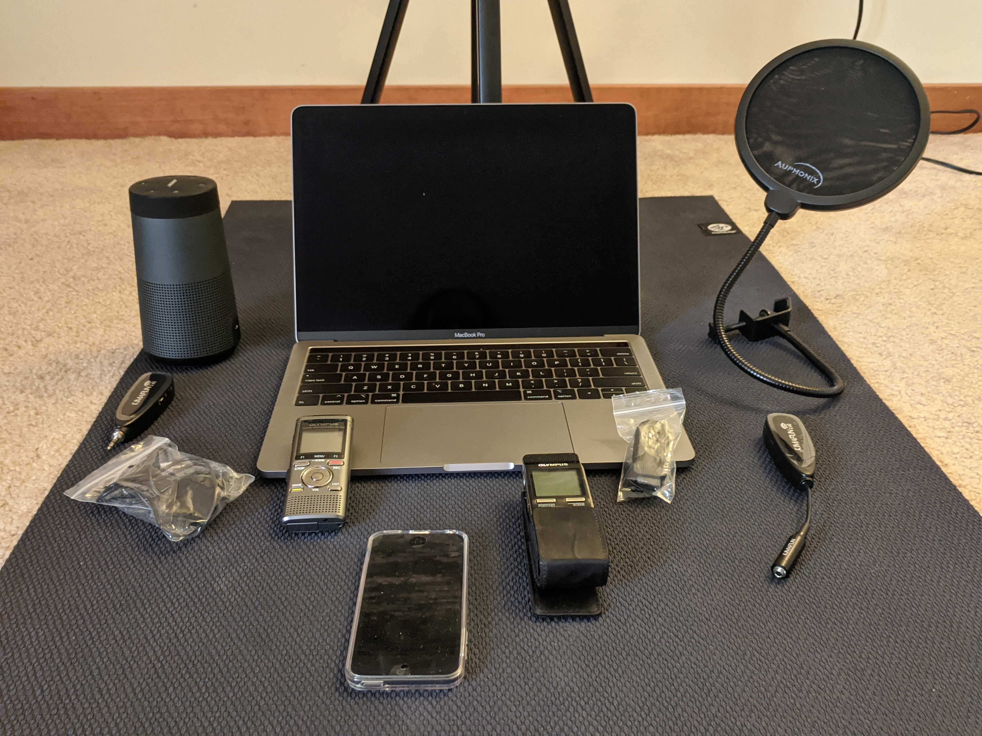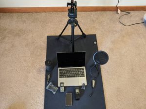Now that we covered the video end of things, here is a quick peek at our podcast studio. Admittedly, I do not use the laptop at all, but it looks good having it there. Essentially, there are four chief components to my simple, low-tech, upgraded podcast studio. There is the new pop filter, which is the coily mesh thing in the upper right corner. I clamp that onto the small silver hand-held recorder that is leaning up on the left front lip of the laptop. Then I use the i-pod touch, which is front center, and that is matched with the wireless speaker that stands to the left of the laptop. I use those four items – along with my eyeglasses to read my chicken-scratch outline – to create the podcasts.