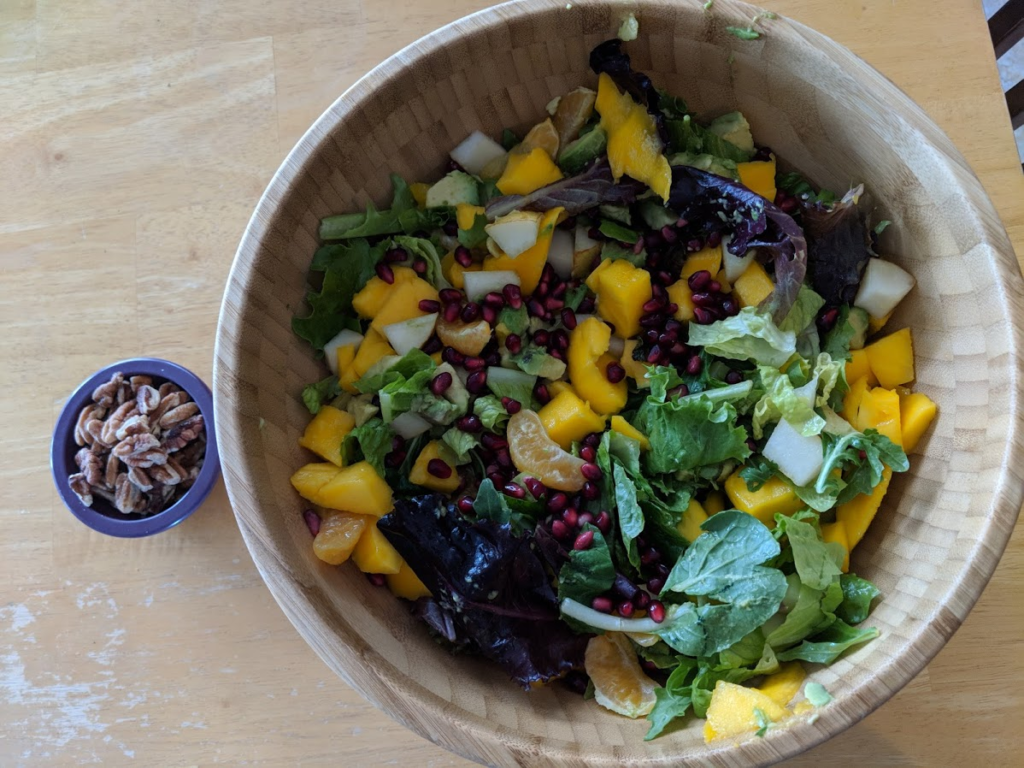 Ellie’s salad featuring: Mixed Greens, Pear, Tangerines, Avocado, Mango, Pecans, Pomegranate Seeds