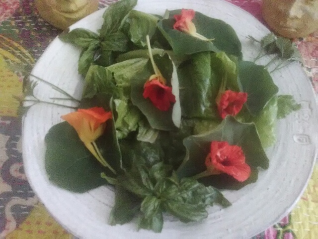 The last of the lettuce from the garden, washed, dried and ripped not chopped. Nasturtium leaves and flowers, all from the garden. I like to add fresh tomatoes when they become ripe, and early in the season, radishes. The dressing is as follows: pour into a small jar some olive oil, red wine vinegar (or any kind of vinegar,) a spoonful of Dijon mustard, a big clove of minced garlic, some chopped fresh tarragon. Screw the top on the jar and shake wildly. Dress the salad sparingly. Sometimes I add a little feta to the salad , some kalamata olives and a few nuts. Oh, and sometimes beets 🙂 Garnish with fresh herbs such as basil and parsley.