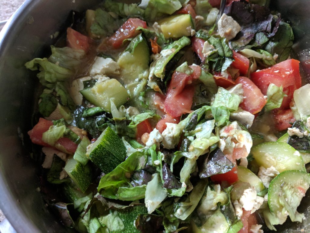 Lightly steamed zucchini & tofu (mashed) in cumin, coriander, ginger, black pepper – then add raw tomatoes, butterhead red lettuce, topped and mixed in with nutritional yeast, Bragg’s Liquid Aminos, apple cider vinegar, tahini, and olive oil. (All ingredients local & organic.)